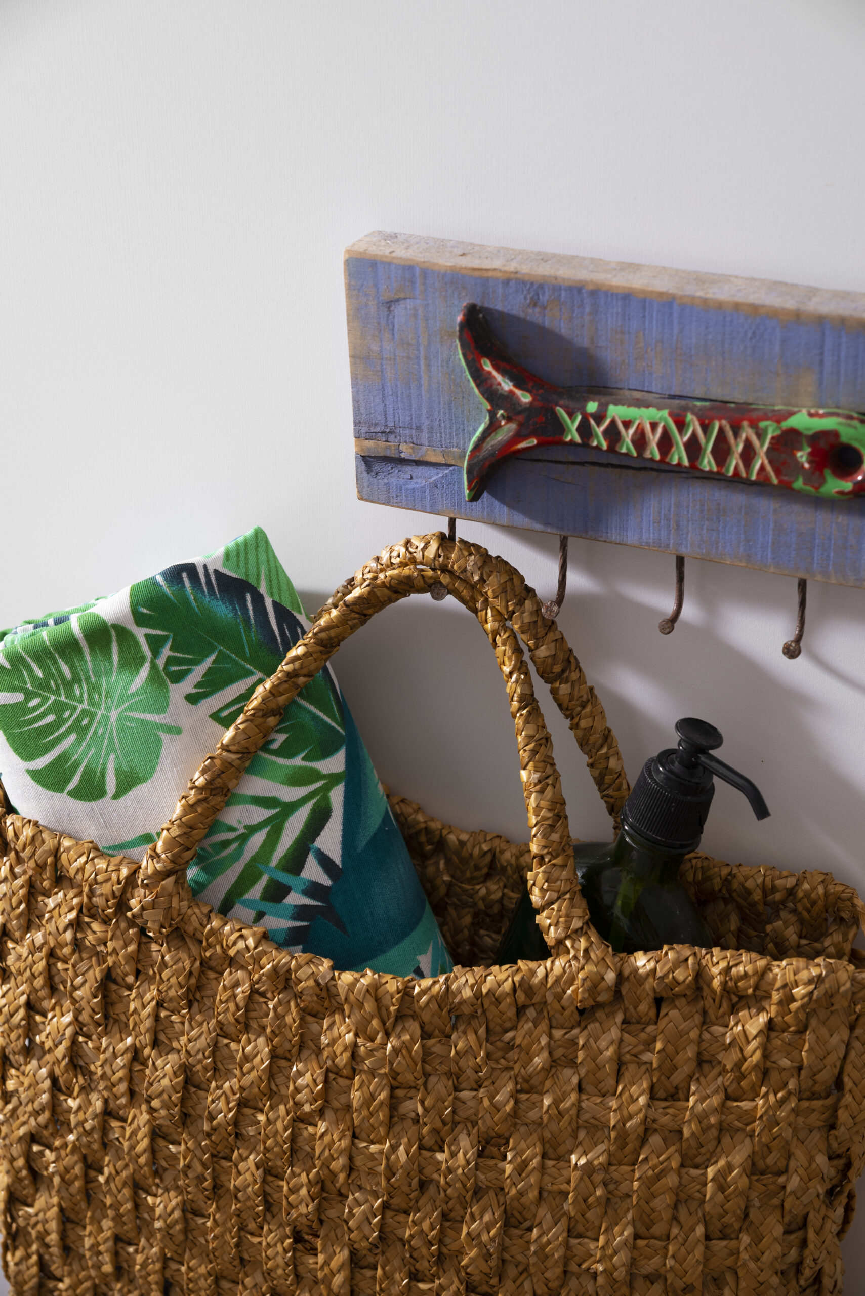 Na imagem, a bolsa aparece decorada com uma canga estampada em verde e branco, trazendo um clima tropical, enquanto um suporte de parede em madeira com detalhe artesanal de peixe reforça a proposta descontraída e veranil.